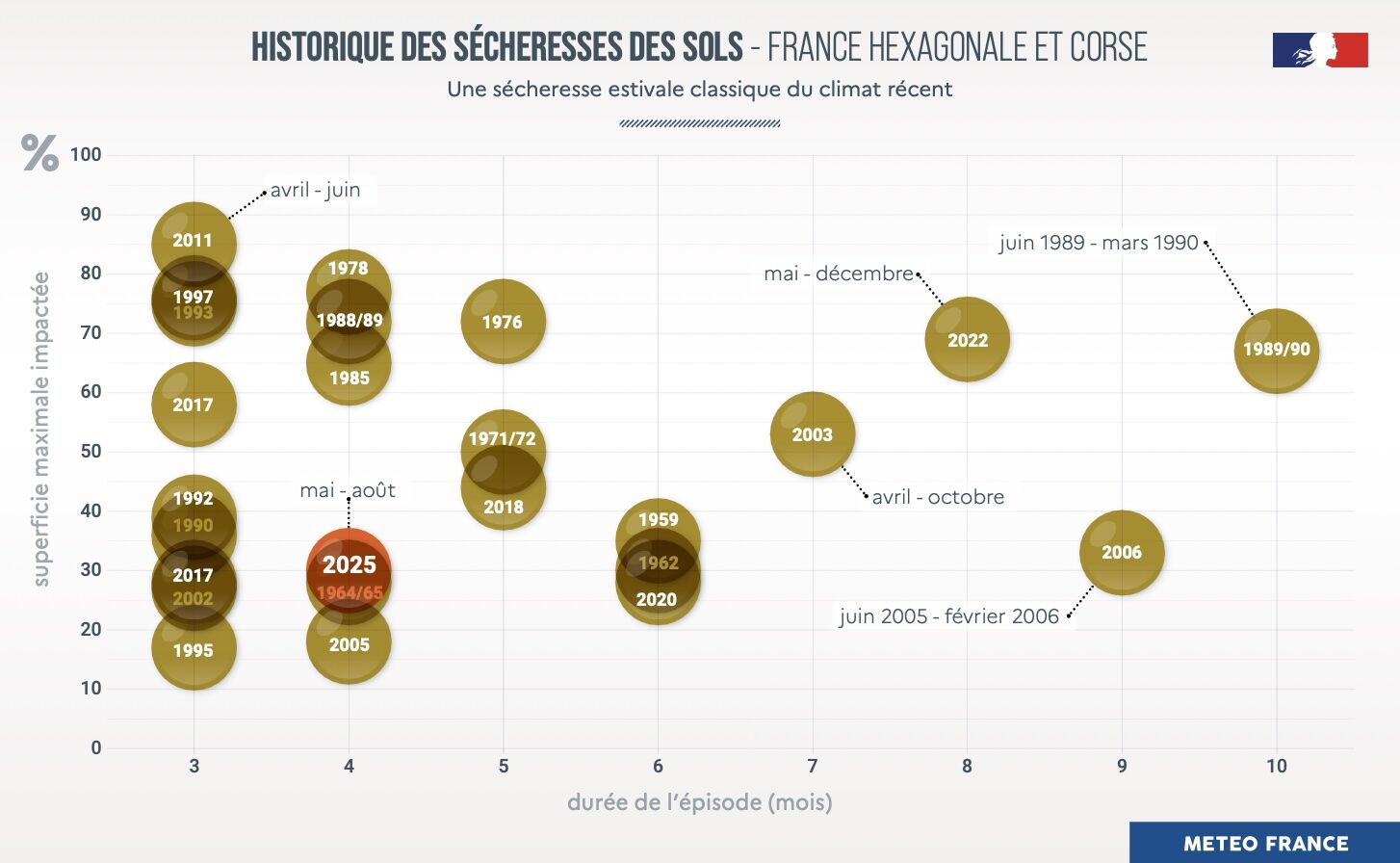 En 2025, un épisode de sécheresse des sols a concerné 30% de la France de manière durable de mai à août (4 mois). Une proportion plus importante du territoire a été impactée, au moins de manière plus ponctuelle. En moyenne sur la France, cet épisode de sécheresse estivale est classique dans le climat