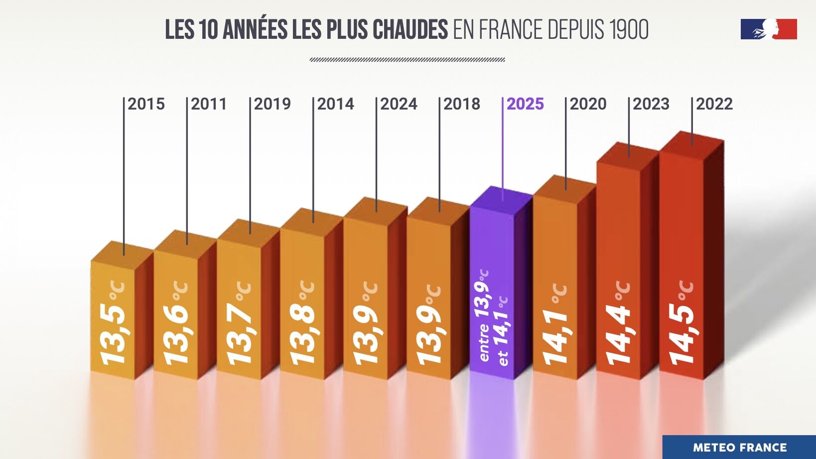 Selon Météo-France, l’année 2025 au 4ème ou au 3ème rang des années les plus chaudes jamais enregistrées en France depuis le début des mesures en 1900. Après une année 2024 très excédentaire, le cumul de précipitations est proche de la normale.