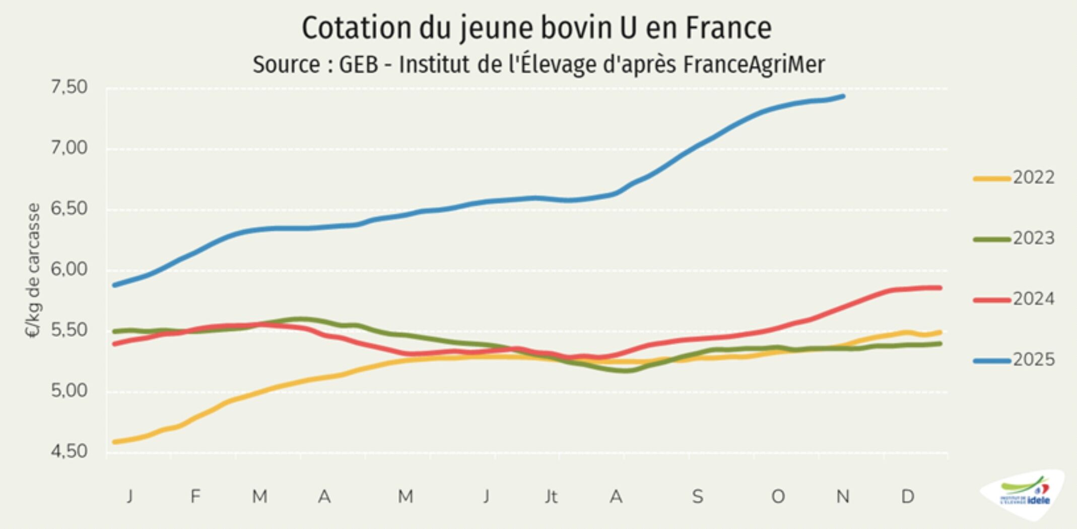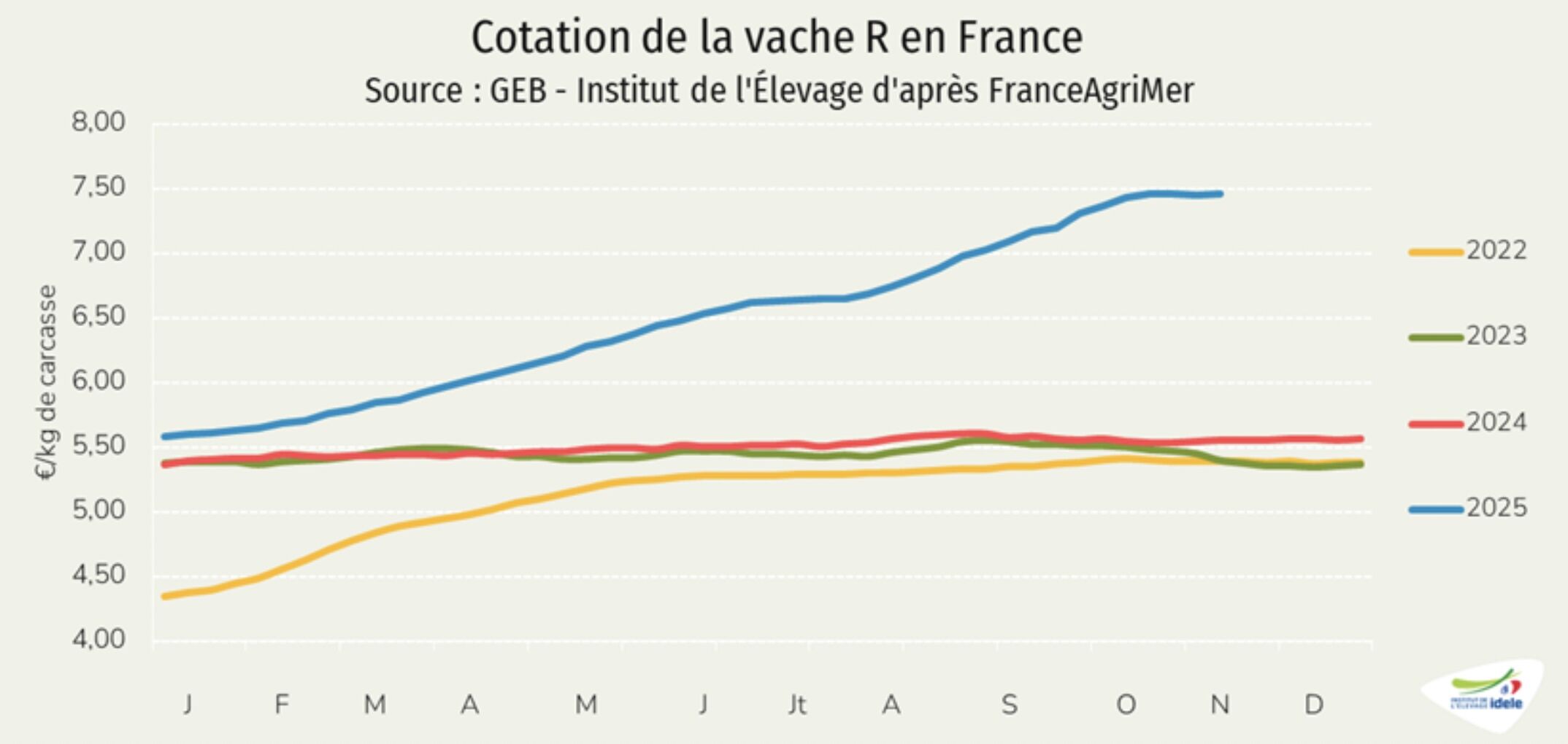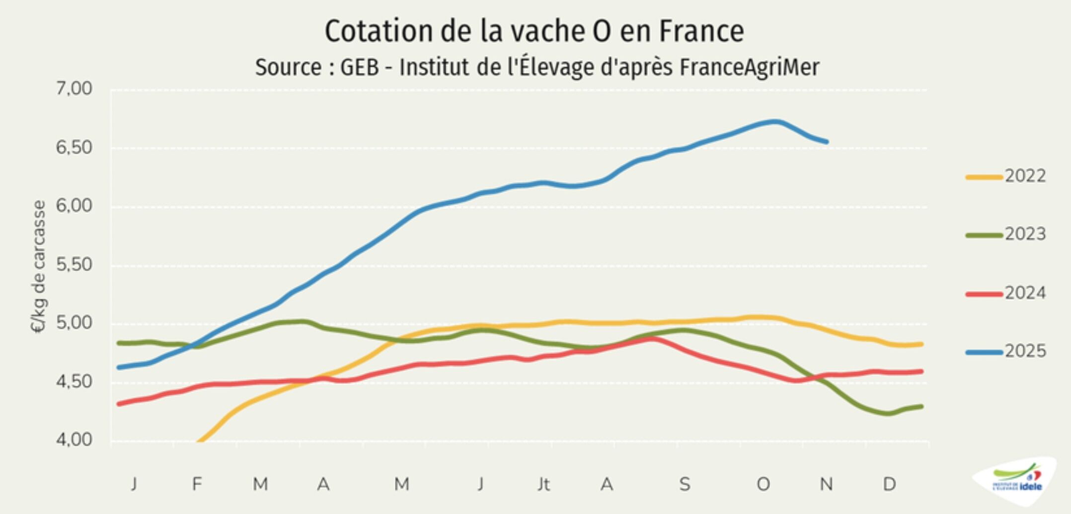 De soin côté, la viande bovine ne s’est jamais aussi bien portée, tout du moins au plan économique, avec des cours qui n’ont jamais été aussi élevés tandis que les coûts de production se réduisent, en en témoigne la dernière livraison d’Agreste, qui fait état d’un baisse de 5,8% du prix des aliments pour gros bovins entre octobre 2024 et octobre 2025.