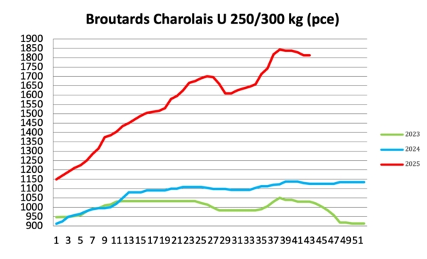 Broutards – La situation est inédite, avec une ministre qui a pris une décision forte de blocage des mouvements d’animaux et des exportations dans la ZR (l’Auvergne-Rhône-Alpes, la Bourgogne-Franche-Comté et l’Occitanie). La vaccination obligatoire est en cours sur zone concernée. Les éleveurs doivent attendre pour commercialiser leurs animaux. Quant aux exportateurs, ils scrutent les conditions qui seront imposées pour la réouverture des marchés. Pas de mouvement ni de référence tarifaire dans les régions concernées. Sur la moitié nord du pays, la demande pour les mises en place de jeune bovin se confronte à une raréfaction de l’offre. Les animaux exportables sont réorientés vers un marché intérieur qui a des besoins. Les tarifs se maintiennent sans trop de difficulté sur les marchés encore en activité.