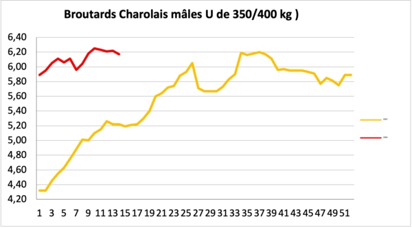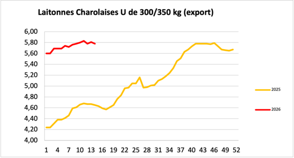 Broutards – Le marché du broutard reste insensible pour le moment, à la tension observée sur le marché de la viande de jeunes bovins. Les volumes restent peu étoffés avec des éleveurs qui vont pouvoir herbager leurs animaux. Les premiers lots de fin d’été (souvent de qualité) sont commercialisés. L’activité commerciale reste très fluide dans les mâles de moins de 350kg pour des mises en place ou de la repousse sur la France. Les ventes sur l’Italie sont modestes dans les volumes, mais les tarifs demeurent à des niveaux élevés dans les bons Charolais ou Limousins de 350/450 kg. En Espagne, le niveau élevé des prix du maigre et la guerre en Iran, ont des conséquences lourdes et peuvent remettre en cause la position exportatrice de ce pays vers le Moyen-Orient ou le Maghreb.