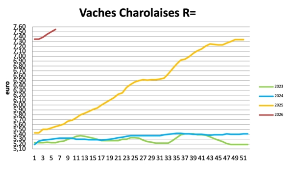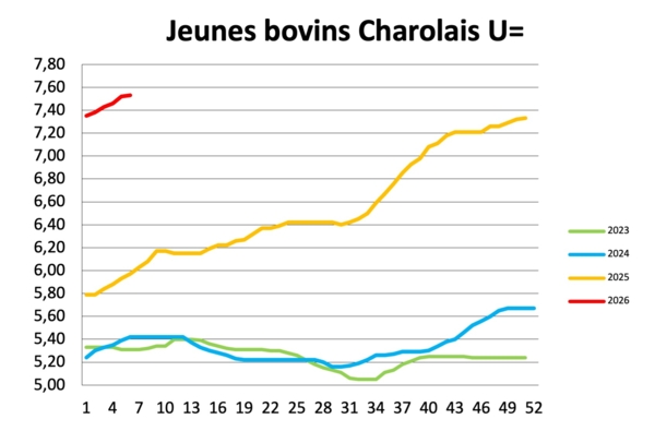 Jeunes bovins – L’équilibre du marché est à la faveur des engraisseurs, alors que le marché se tend dans le secteur aval avec un recul de la demande italienne sur les arrières. Les tarifs se stabilisent à des niveaux élevés, mais nécessaires pour faire face à l’emballement des prix pratiqués dans les broutards. Le flux vers l’Allemagne reste soutenu à la veille du ramadan. Les JB R sont largement utilisés pour le marché intérieur pour compenser le manque de vaches.