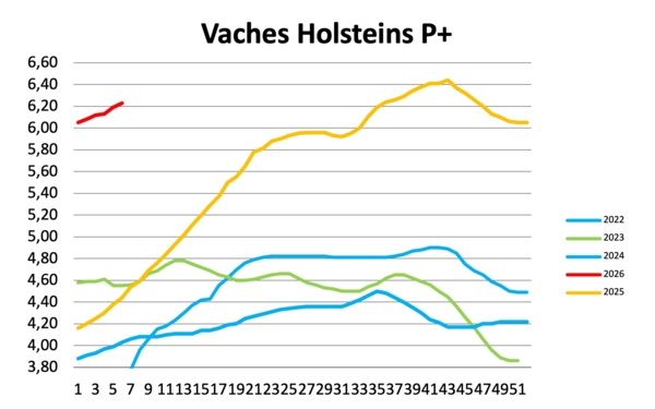 Réformes laitières – Les industriels, qui n’ont pas de gros besoins avec le début des vacances d’hiver, font face à une réduction de l’offre. La tendance haussière observée depuis quelques semaines se confirme. Les éleveurs qui ont compris l’intérêt que peut apporter une finition de leurs animaux font le choix de garder leurs vaches pour une mise à l’herbe afin de coupler le gain de poids, de conformation et du prix. La tendance de la semaine est à la hausse pour l’ensemble des réformes Prim’Holsteins, Normandes ou Montbéliardes. Les transformateurs restent très inquiets pour les mois à venir au regard de la forte décroissance de la production laitière. Les tarifs se raffermissent également dans les taureaux de réformes.