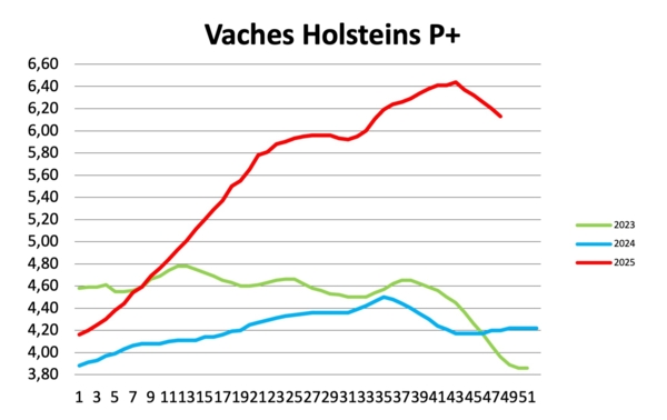 Réformes laitières – Les ventes de viande hachée fraîche sont sérieusement impactées en cette fin de mois par les achats non alimentaires, qui passe au second plan. Il n’y a pas de black Friday alimentaire. Le surgelé résiste mieux avec un prix souvent plus abordable pour les familles. Les abatteurs profitent de sorties saisonnières plus abondantes pour peser sur les prix des réformes laitières dans un contexte européen également baissier. Les industriels sont conscients que les volumes actuels ne vont pas perdurer et que le scénario qui a prévalu tout au long de l’année va se reproduire. Ils refont leurs stocks pour mieux aborder cette décroissance, non sans une certaine inquiétude de l’inflation qu’elle génère. Pour le moment, la tendance reste baissière avec des réformes Prim’Holsteins qui se rapprochent des 6,00€. La dégradation des prix est un peu moins marquée dans les Normandes ou Montbéliardes viandées. Dans cette période de forte tension, les abatteurs accentuent la pression sur les vaches bas de gamme et en manque de viande (P-1). Les taureaux de réformes se maintiennent.