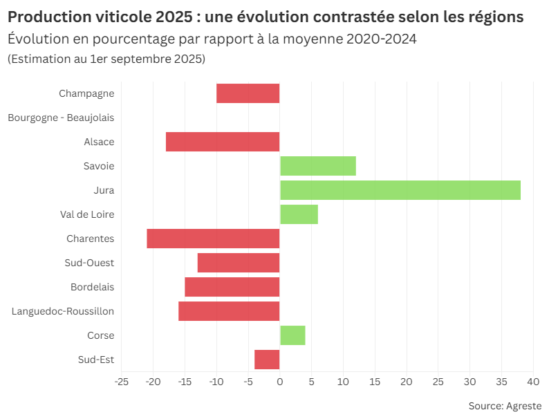 En Champagne, la hausse serait de 12%, malgré un millerandage marqué lié à une floraison difficile et à des vignes éprouvées par la chaleur en août. La récolte champenoise resterait toutefois inférieure de 10% à la moyenne quinquennale.