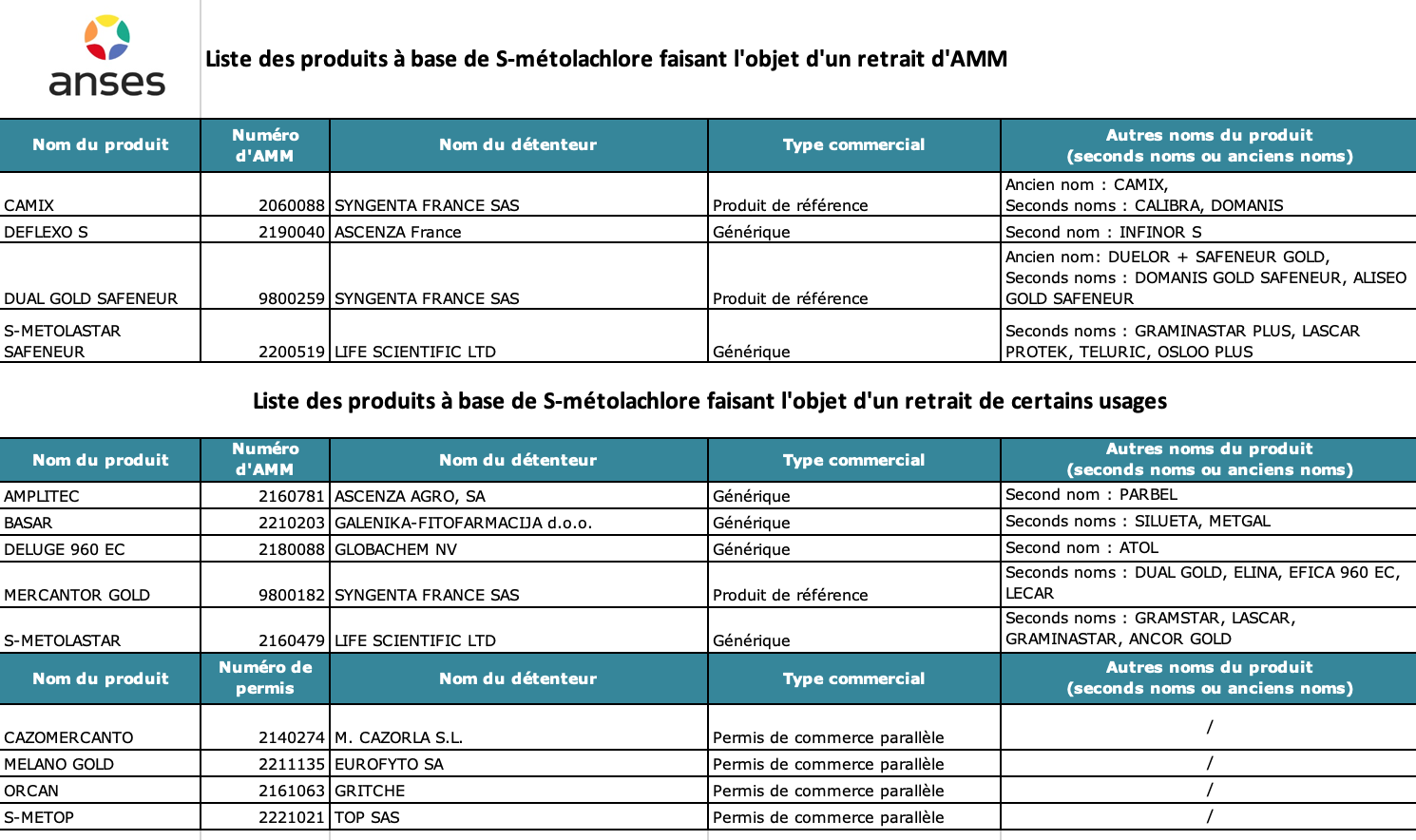 Camix, Deflexo S, Dual Gold Safeneur et S-Metolastar Safeneur : tels sont les quatre spécialités auxquelles l’Agence nationale de sécurité sanitaire de l'alimentation, de l'environnement et du travail (Anses) a retiré l’autorisation de mise sur le marché (AMM) le 20 avril. Le même jour, l’agence sanitaire a par ailleurs procédé au retrait de certains usages pour les spécialités Amplitec, Basar, Deluge 960 EC, Mercantor Gold et S-Metolastar. Cinq spécialités sont enfin concernées par un retrait de certains usages : Cazomercanto, Melano Gold, Orcan et S-Metop. La fin de vente et de distribution est fixée au 20 octobre 2023 et la fin d’utilisation des stocks de produits au 20 octobre 2024.