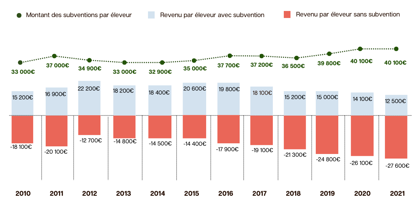 Selon la FNH, dont l’analyse repose sur des données officielles et publiques (Institut de l’élevage, FranceAgriMer, OFPM, RICA…) et sur des calculs du Basic, les subventions aux éleveurs allaitants ont augmenté de 20% entre 2010 et 2021, passant de 33.000€ à 40.100€, tandis que leur revenu, exprimé en Smic horaire net, est passé de 0,85 à 0,56. Bilan : « des exploitations perfusées aux subventions pour des éleveurs toujours plus pauvres », tranche la FNH, qui pointe l’inefficacité des loi Egalim, censées sanctuariser les coûts de production. Entre 2018 et 2022, le prix de vente moyen par kilo était inférieur de 0,99 euro au coût de production, selon des données de la Chambre d’agriculture du Cantal. « Les éleveurs sont la seule profession qui vend à perte », rappelle Elyne Etienne, responsable du programme élevage à la FNH.