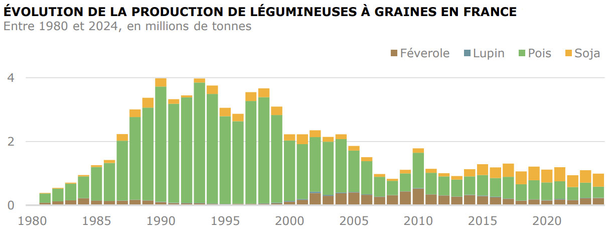En 2024, les surfaces de légumineuses à graines représentaient 430 000 hectares en France, pour une production de 1,1 million de tonnes. Des chiffres en dessous de la moyenne des dix années précédentes, et ce, malgré des objectifs ambitieux du Plan protéines mis en œuvre à partir de 2020.