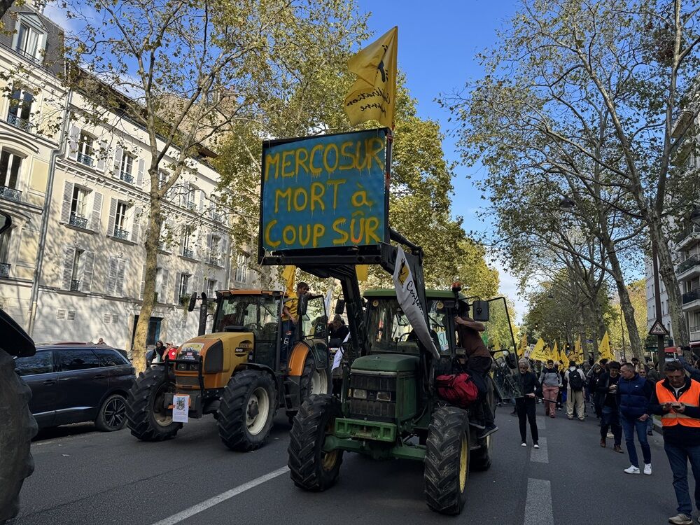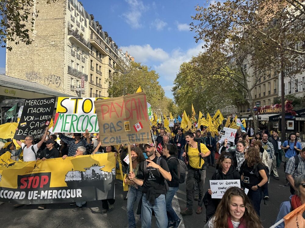 Des centaines d'agriculteurs, étudiants et défenseurs de l'environnement ont défilé le 14 octobre à Paris à l'appel de la Confédération paysanne contre le projet d'accord entre l'UE et le Mercosur, considéré comme « mortifère pour les paysans », d'Occitanie comme d'Amazonie.