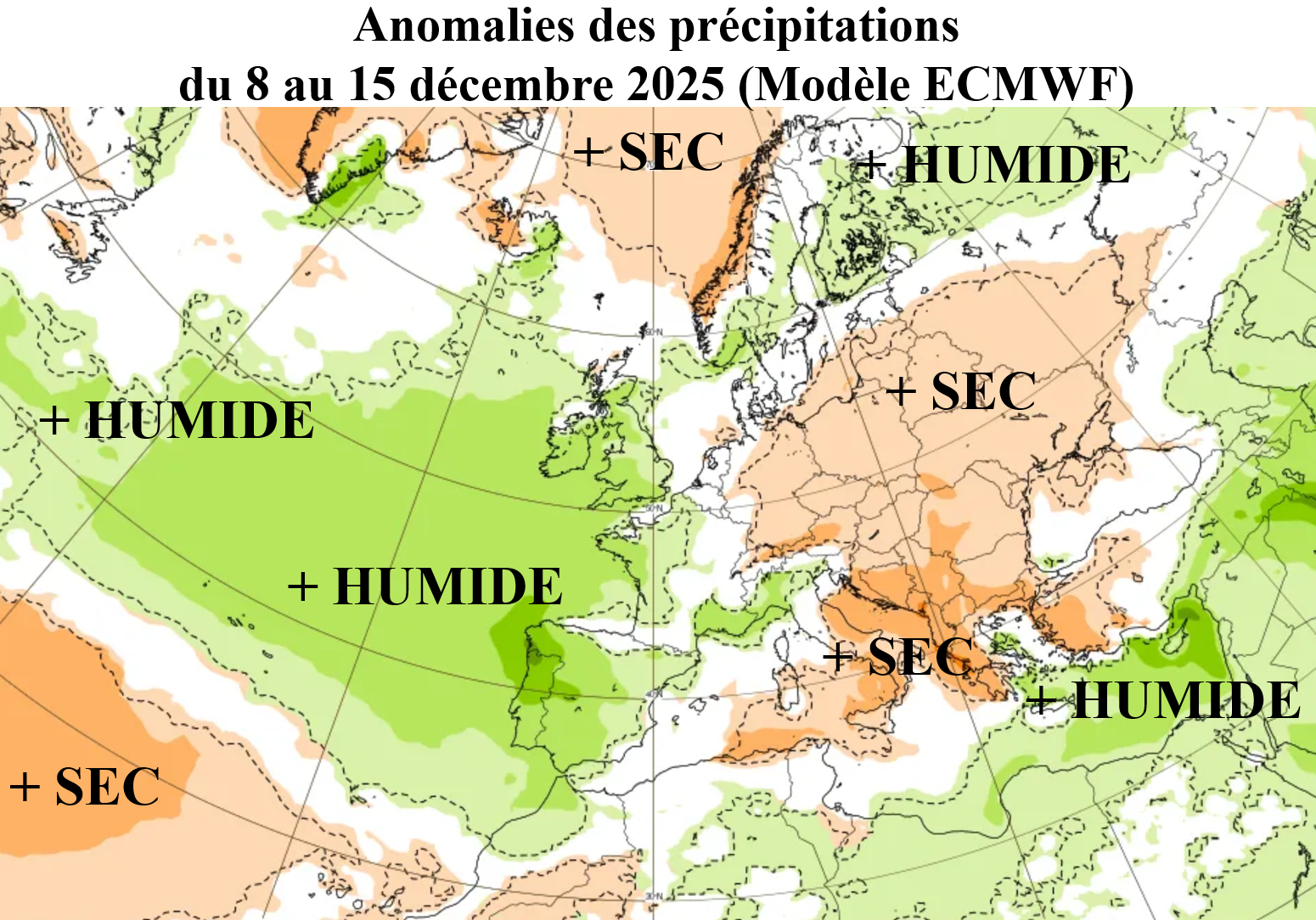 Après une 1ère semaine de décembre perturbée, sans phénomènes météorologiques particuliers (sans intempéries), c’est-à-dire avec de la pluie principalement sur l’ouest et le sud-est du pays, la 2ème devrait être plus agitée avec un flux océanique plus dynamique et donc un risque de précipitations plus fréquentes, plus soutenues et des vents plus forts. Les signes d’un retour d’un temps calme et sec, sous l’influence de hautes pressions, sont très limités !