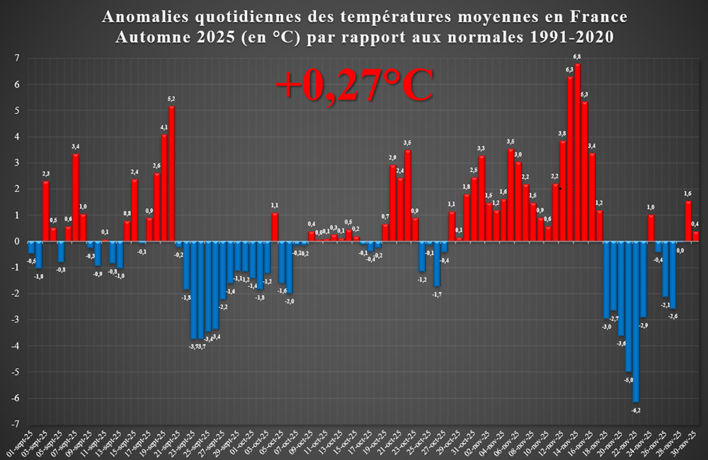 Les chiffres des anomalies des températures de cet automne 2025 : Septembre 2025 : -0,14°C Octobre 2025 : +0,19°C Novembre 2025 : +0,76°C Automne 2025 : +0,27°C |