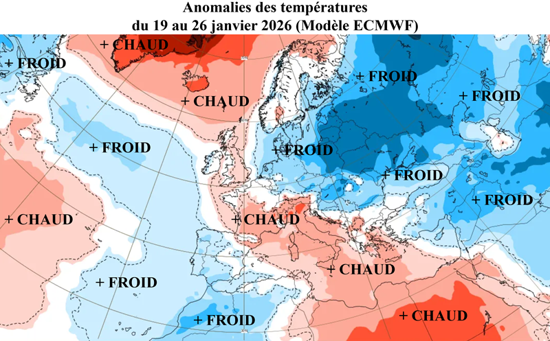 Il est clairement établi que jusqu’au 25 janvier, la France restera sous des températures plutôt douces pour la saison, même si une baisse progressive est envisagée (retour aux normales climatiques). En revanche, les précipitations se concentreront sur nos régions méridionales et notamment celles allant de la Corse au Languedoc-Roussillon où les cumuls pluviométriques vont devenir importants d’ici le mercredi 21 janvier 2026.