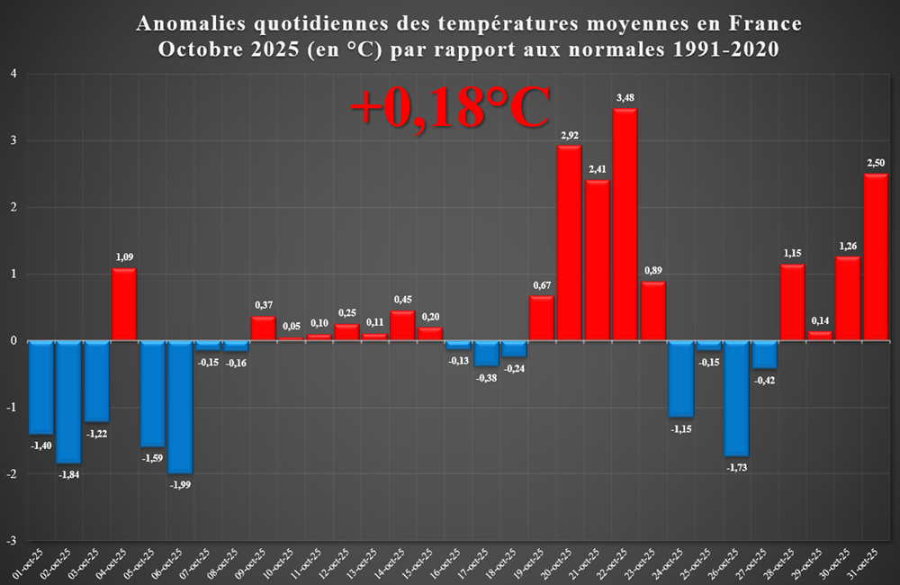 Réjouissons-nous de vivre des températures proches des normales climatiques en France, mais ne soyons pas nombrilistes. En effet, à l’échelle de la Terre, cette fin octobre est la période la plus chaude jamais enregistrée, dépassant même 2023 et 2024… le réchauffement climatique se poursuit inlassablement !