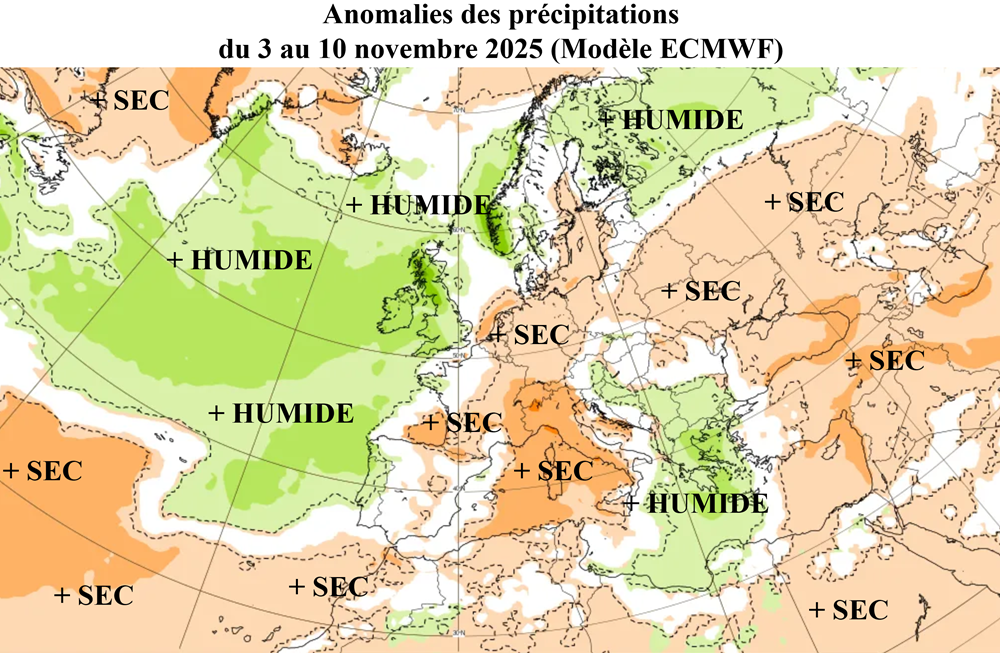 En revanche, pour la semaine prochaine, la France sera sous l’influence de l’ex-ouragan Melissa, qui a malheureusement dévasté la Jamaïque mardi 28 octobre 2025. En phase d’extra-tropicalisation, l’ex-ouragan Melissa affectera la pointe est de Terre-Neuve samedi, avant de continuer sa route vers l’Islande entre le lundi 3 et le mardi 4 novembre. Étant donné sa position, cette dépression, tout à fait classique, fera remonter une masse d’air chaud subtropical ainsi que les hautes pressions associées. Les conditions anticycloniques devraient donc s’imposer en première partie de semaine prochaine avant une très probable dégradation attendue au cours de la journée du mercredi 5 novembre par l’ouest du pays.