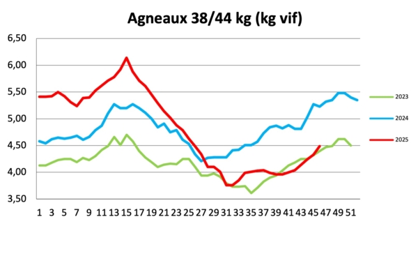 Agneaux – La consommation saisonnière est peu soutenue avec un manque de positionnement dans les linéaires dans les magasins, néanmoins les abatteurs subissent la loi d’un marché moins chargé avec des tarifs qui se raffermissent pour l’ensemble des catégories d’agneaux.
