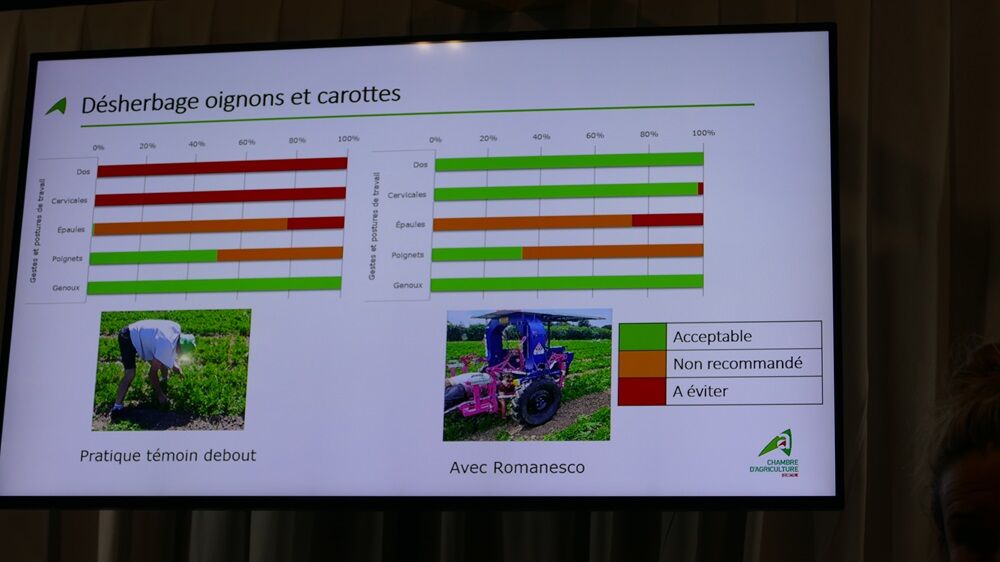 Après réalisation d’une quarantaine de grilles de pénibilité, le résultat est net : « Même si certains outils font des transferts de pénibilité, par exemple du dos vers les épaules, tous améliorent globalement le score ». Ces équipements sont donc efficaces, mais leur prix peut sembler élevé pour des « petites » exploitations comme le sont souvent les fermes en maraîchage diversifié : de 1300 € pour l’exosquelette à 45 000 € pour le Romanesco…