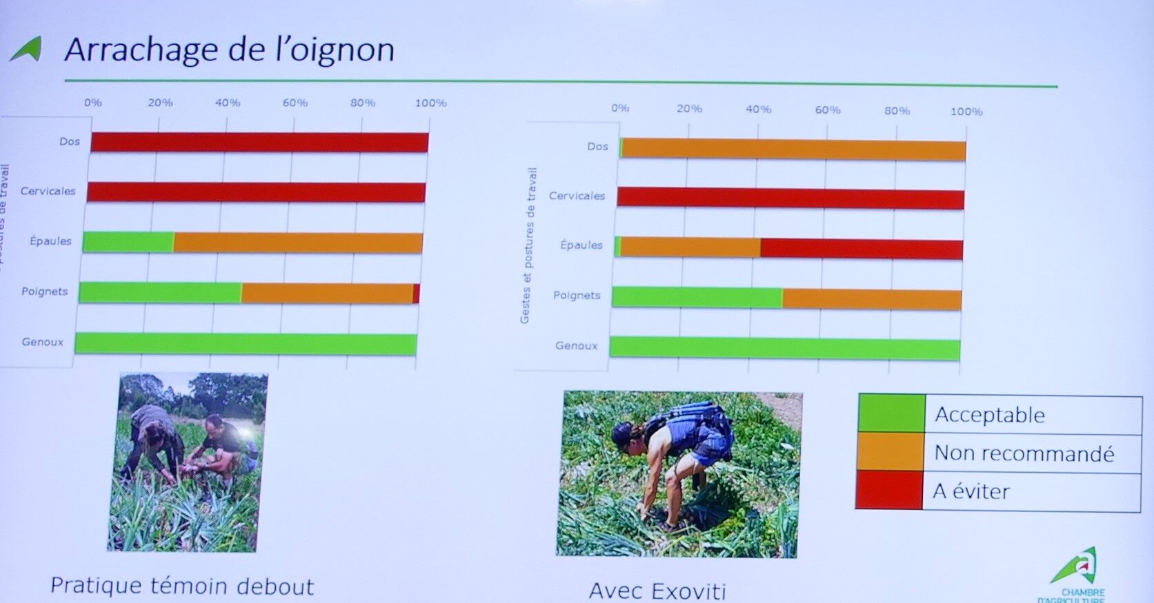 « Nous sommes partis de presque rien… On s’est rendu compte qu’il n’existait pas de grilles de pénibilité, pas de protocoles établis ». L’équipe de la station expérimentale remonte alors aux sources, à savoir les dix facteurs de risques décrits dans le Code du travail : postures pénibles, vibrations mécaniques, agents chimiques dangereux (poussières et fumées incluses), activités en milieu hyperbare, températures extrêmes, bruit, travail de nuit, travail en équipes successives alternantes, travail répétitif. Le constat est raide : « Le maraîchage diversifié est concerné par au moins 7 de ces 10 facteurs ».