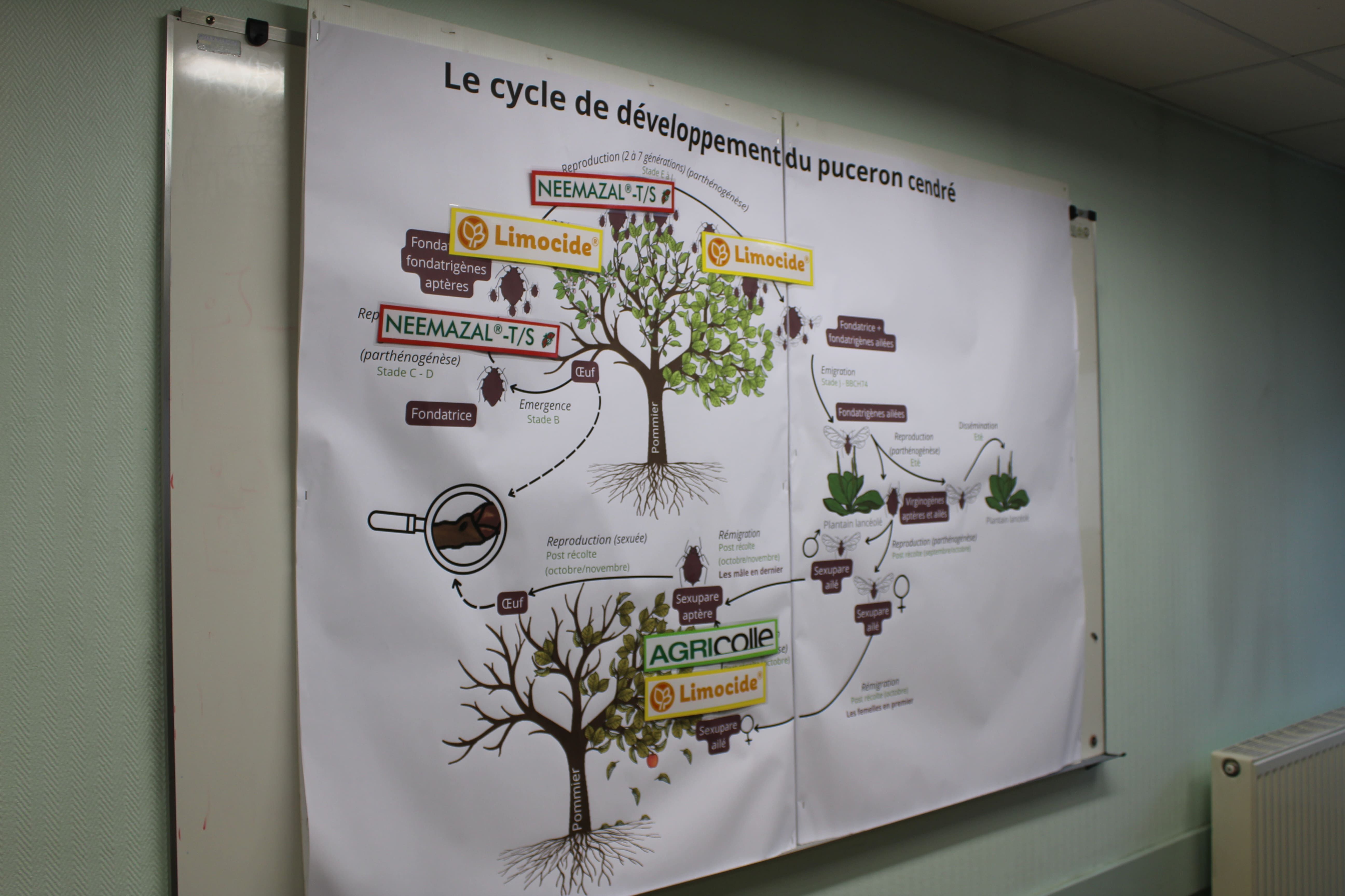 Le produit "Limocide" de Vivagro a lui un effet par contact en asséchant les pucerons afin de trouer la membrane et de bloquer le trachéole. Il peut s’appliquer en préfloraison, mais aussi depuis deux ans en floraison. « Nous travaillons maintenant sur un positionnement durant l’automne lorsque les pucerons reviennent. Nous avons une dérogation 120 jours en attente », évoque Ingrid Lemaitre chez Vivagro.