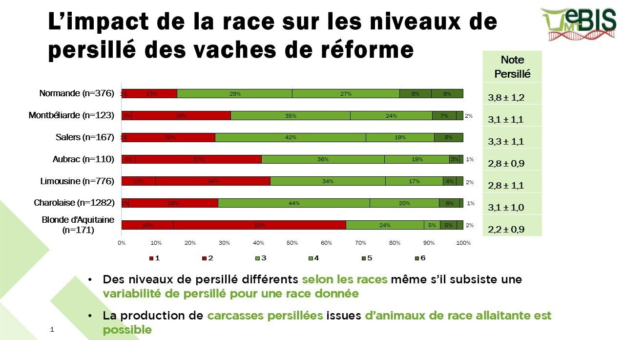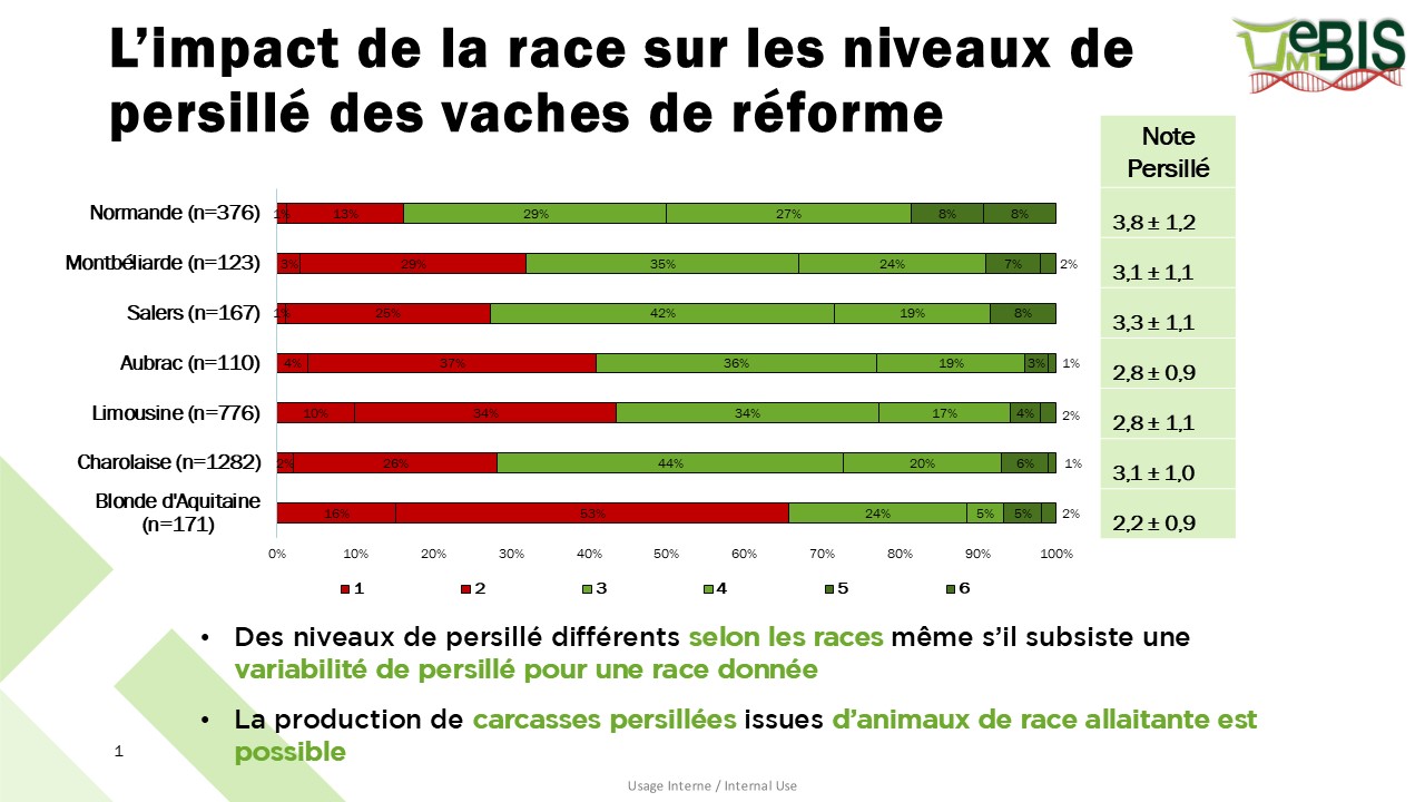 Le persillé est un critère d’intérêt sur lequel la filière viande bovine travaille pour garantir la qualité organoleptique de ses produits. Les tests consommateurs montrent que le meilleur compromis entre l’évaluation visuelle du produit cru (plus favorable aux produits maigres), et l’évaluation gustative (plus favorable aux produits ayant plus de gras intramusculaire) se situe à un niveau de persillé de 3 à 4, selon la notation de la grille harmonisée de notation visuelle, allant de 1 (absence de persillé) à 6 (viande extrêmement persillée).