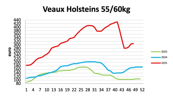 Veaux d’engraissement et d’élevage – Le marché retrouve un certain équilibre. Les mises en place sont un peu moins importantes pour des volumes qui tendent à se replier. La qualité de l’offre est en revanche une préoccupation des intégrateurs, qui maintiennent un tri sévère dans les veaux légers. Les veaux sans potentiel restent invendables. Les transactions sont en revanche très fluides dans les bons veaux, Holsteins, Montbéliards, Abondances et Normands, qui sont prisés pour l’export ou l’intégration.