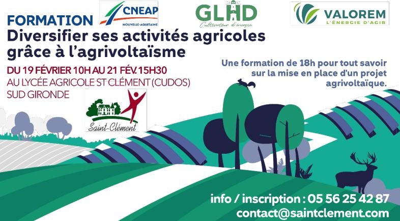 Le CNEAP (Conseil National de l'Enseignement Agricole Privé) et le Lycée Saint Clément, en partenariat avec GLHD et VALOREM, entreprises spécialisées dans les énergies renouvelables, lancent la première formation complète sur l’agrivoltaïsme destinée aux agriculteurs. Son contenu pédagogique, autant théorique que pratique (visite d’un site pilote agrivoltaïque), a été conçu pour répondre à toutes les questions que peuvent se poser les professionnels agricoles ou personnes en reconversion intéressées par l’innovation agrivoltaïque et souhaitant s’engager dans un projet. La formation est délivrée par Sylvain Mouche, responsable innovation agriculture de GLHD, et Thomas Di Franco, chef de projet en agrivoltaïsme chez VALOREM. « Cette formation s’adresse tout particulièrement à ceux qui cultivent une même passion pour l’agriculture avec l’ambition particulière d’agir sur les enjeux de transition, agricole, écologique, énergétique… Dans cet objectif, la production agricole en système agrivoltaïque, c’est-à-dire en synergie avec de la production d’électricité décarbonée, représente une véritable opportunité à condition de réunir un certain nombre de conditions légales, environnementales, etc. » expliquent-ils, avant d’ajouter : « Les agriculteurs sont en première ligne face aux aléas climatiques et économiques et l’agrivoltaïsme fait partie des solutions pertinentes face à ces défis. L’objet de cette formation est de fournir les bonnes clés pour comprendre les enjeux, le potentiel mais aussi les contraintes. » Le module 1 de la formation est organisée en Sud Gironde à Cudos près de Bazas du 19 février au 21 février 2024 dans le cadre du Lycée Agricole St Clément.